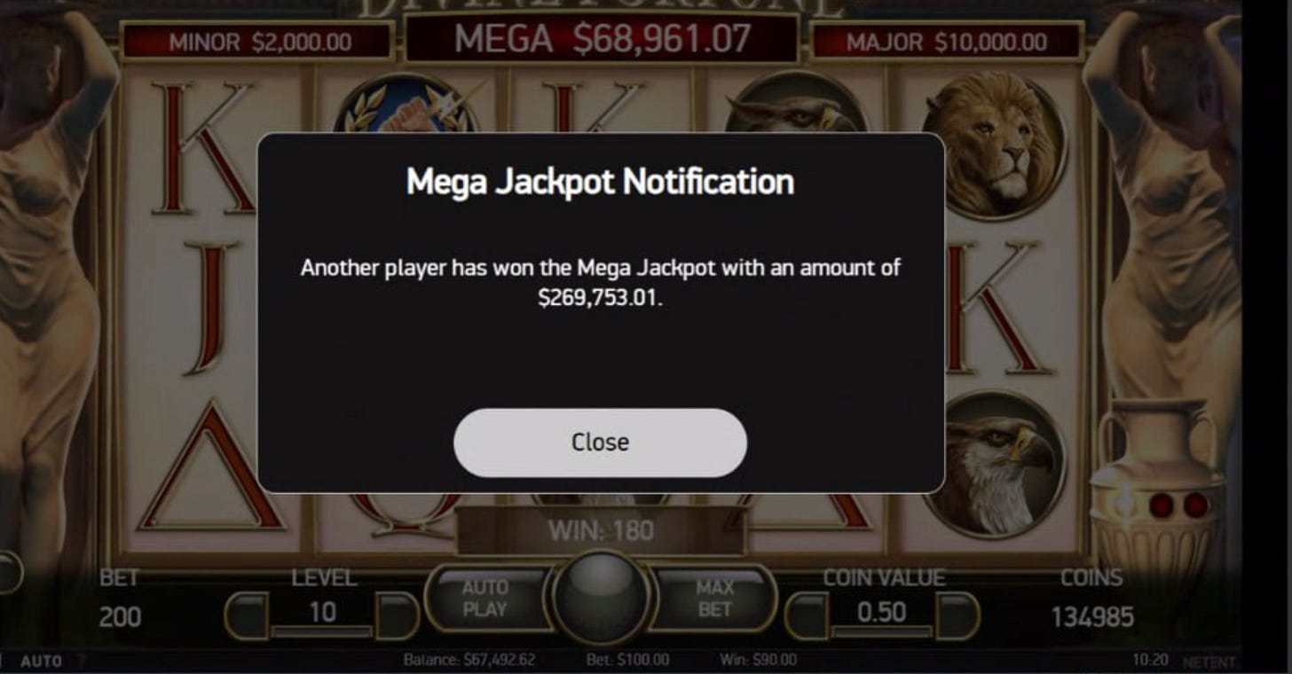 I had been playing for 30 hours straight. Slept maybe two or three hours during that whole stretch. And at some point this message popped up on screen: another player has won the Mega Jackpot with an amount of $547,543.92.