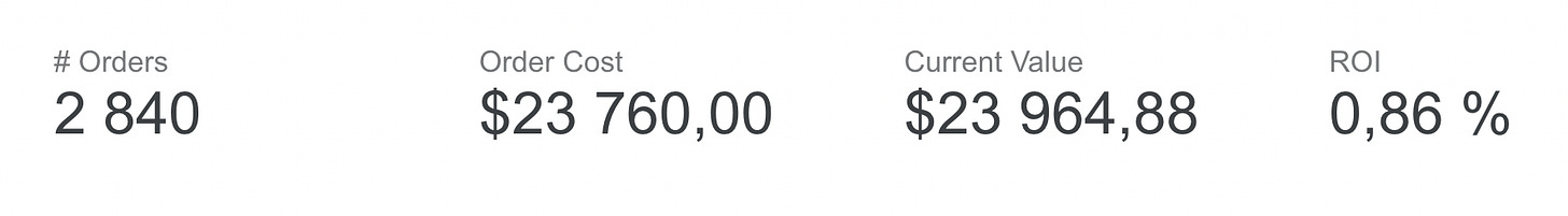 The second account is different. I'm running a hypothesis there: small bets first, scale up if it works. A bot handles all the trades, exclusively on sports events. The logic is dead simple — so simple I suspect a lot of sports bettors are doing the same thing. I'll write about it properly once the experiment reaches a conclusion. For now, here are the interim numbers: nearly 3,000 predictions, ~1% ROI.