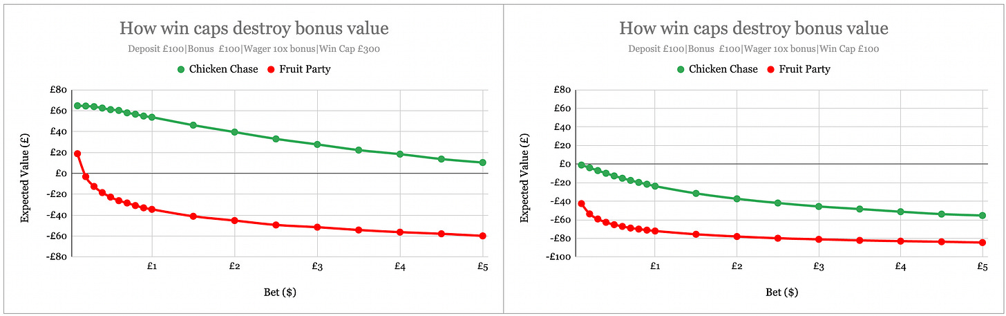 So players will clear wagering requirements more often. But their winnings can get slashed. Win £4,000, receive £300. These bonuses can have negative value if you play the wrong games at the wrong stakes, even with low wagering.