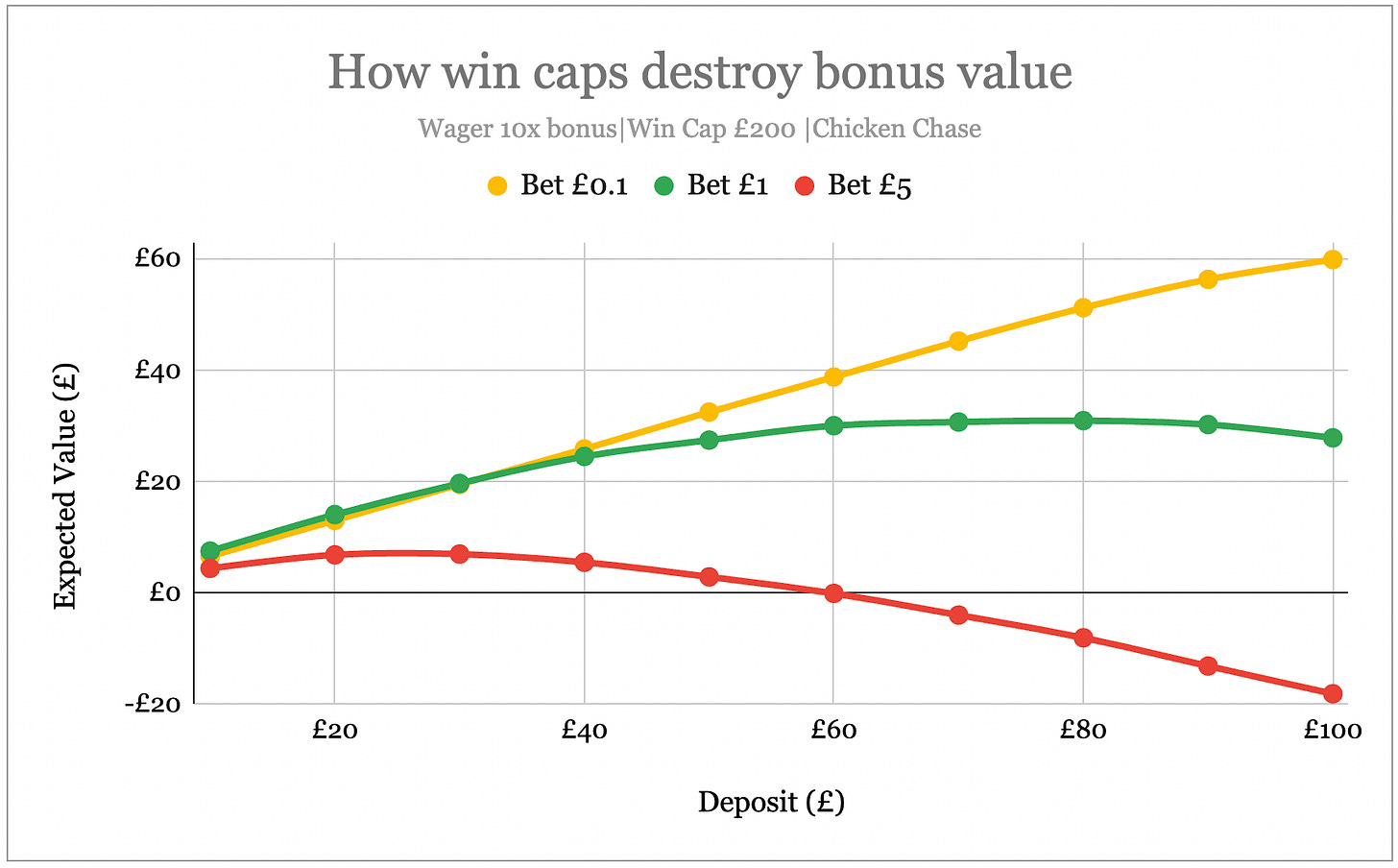 Playing at the minimum £0.10 bet, EV increases with deposit size. But for £1 and £5 bets, there’s an inflection point where larger deposits actually decrease bonus value.